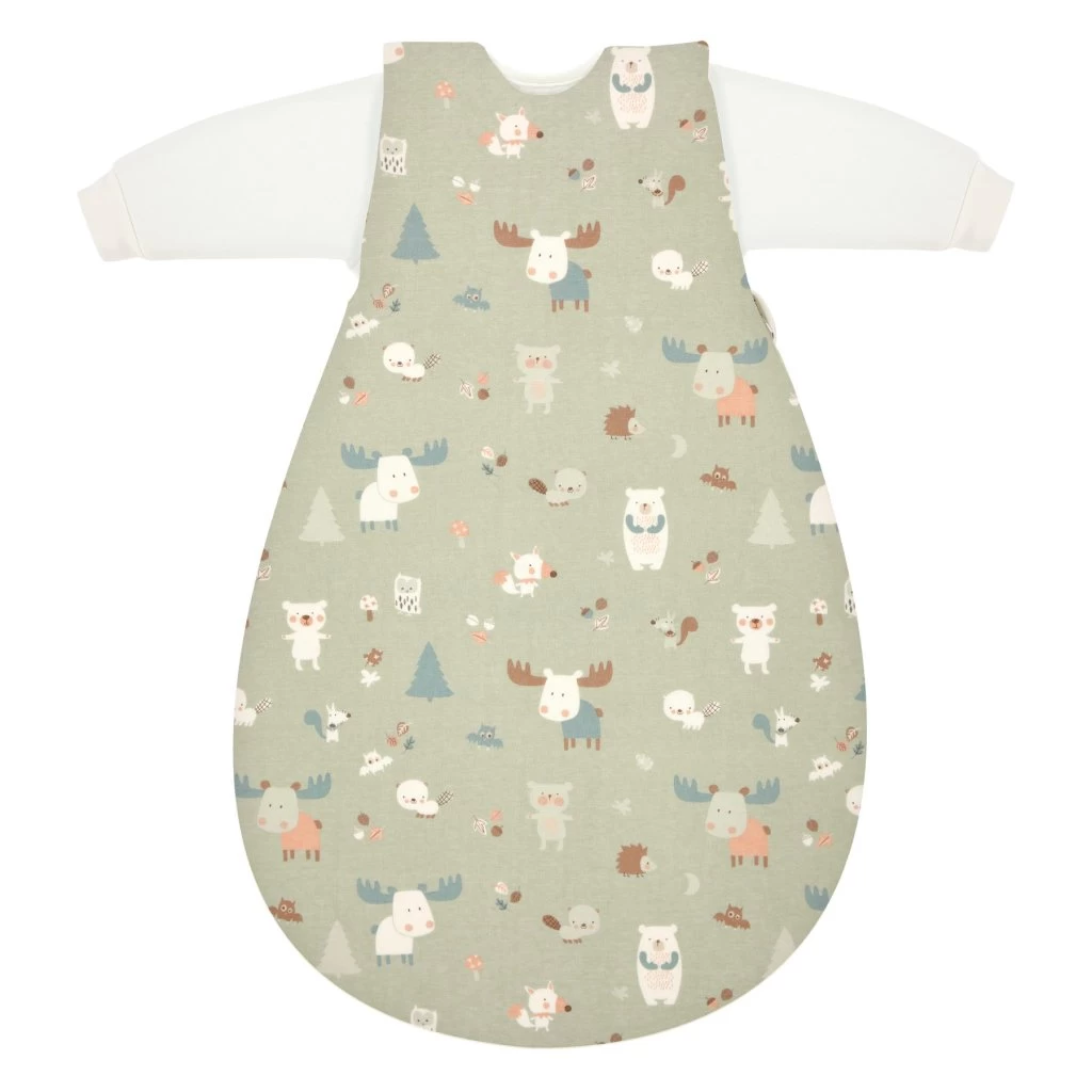 Bestehend aus: 1 birnenförmiger, mitwachsender Außensack mit umlaufendem Reißverschluss, 1 großer Innensack mit Ärmeln, Wickeltechnik + 1 kleiner Innensack mit Ärmeln, Wickeltechnik. Das clevere System lässt sich an jedes Raumklima anpassen: In heißen Sommernächten kann der Innensack auch solo benutzt werden. Viel Strampelfreiheit durch spezielle Birnenform des Innen- und Außensacks. Hals- und Armausschnitt über Knopfsystem verstellbar.