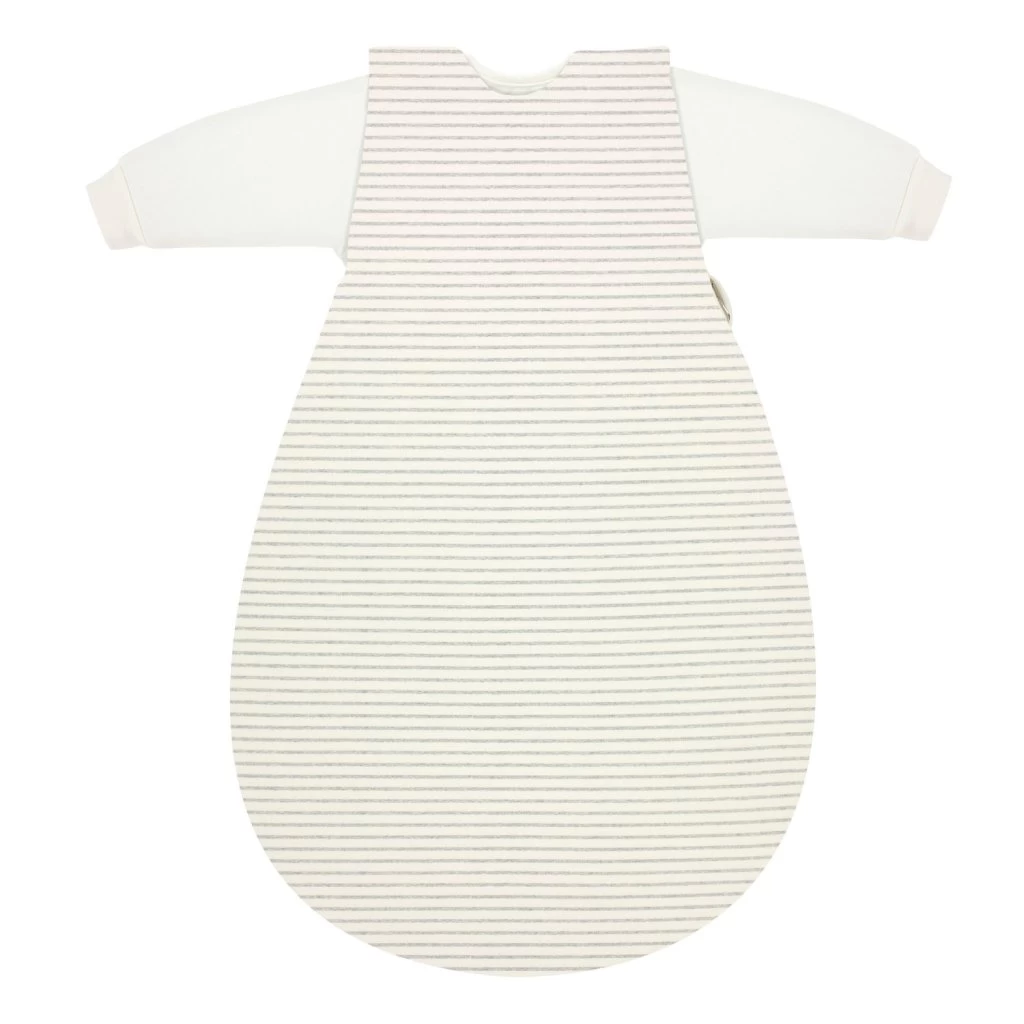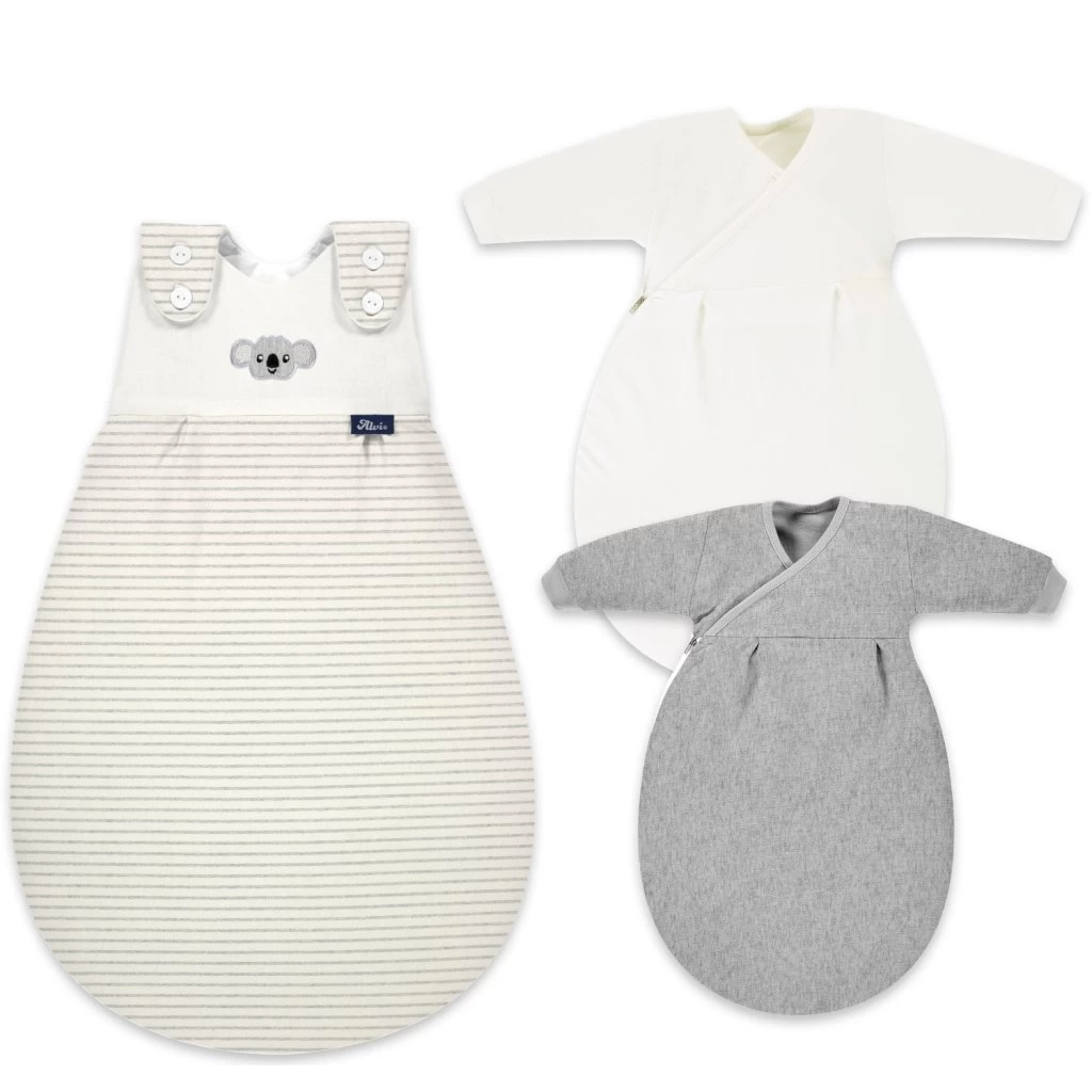 Bestehend aus: 1 birnenförmiger, mitwachsender Außensack mit umlaufendem Reißverschluss, 1 großer Innensack mit Ärmeln, Wickeltechnik + 1 kleiner Innensack mit Ärmeln, Wickeltechnik. Das clevere System lässt sich an jedes Raumklima anpassen: In heißen Sommernächten kann der Innensack auch solo benutzt werden. Viel Strampelfreiheit durch spezielle Birnenform des Innen- und Außensacks. Hals- und Armausschnitt über Knopfsystem verstellbar.