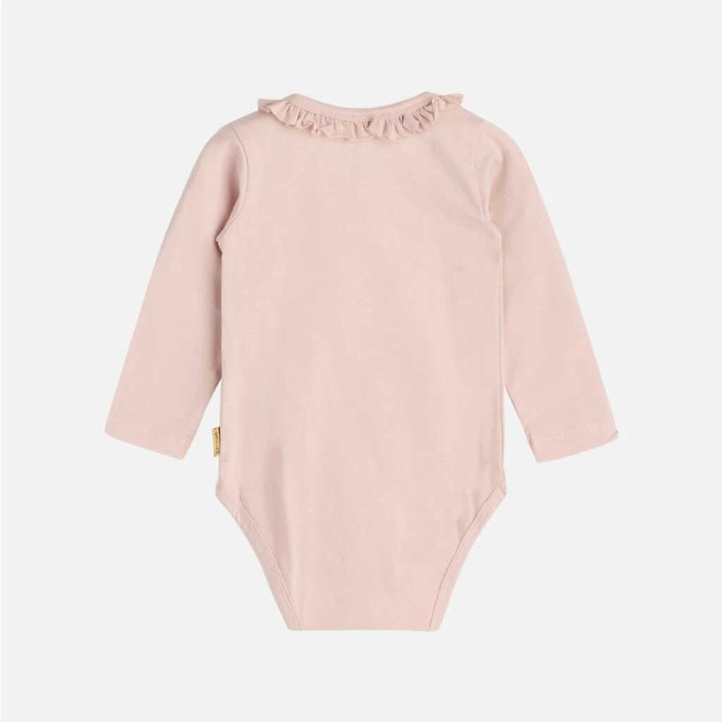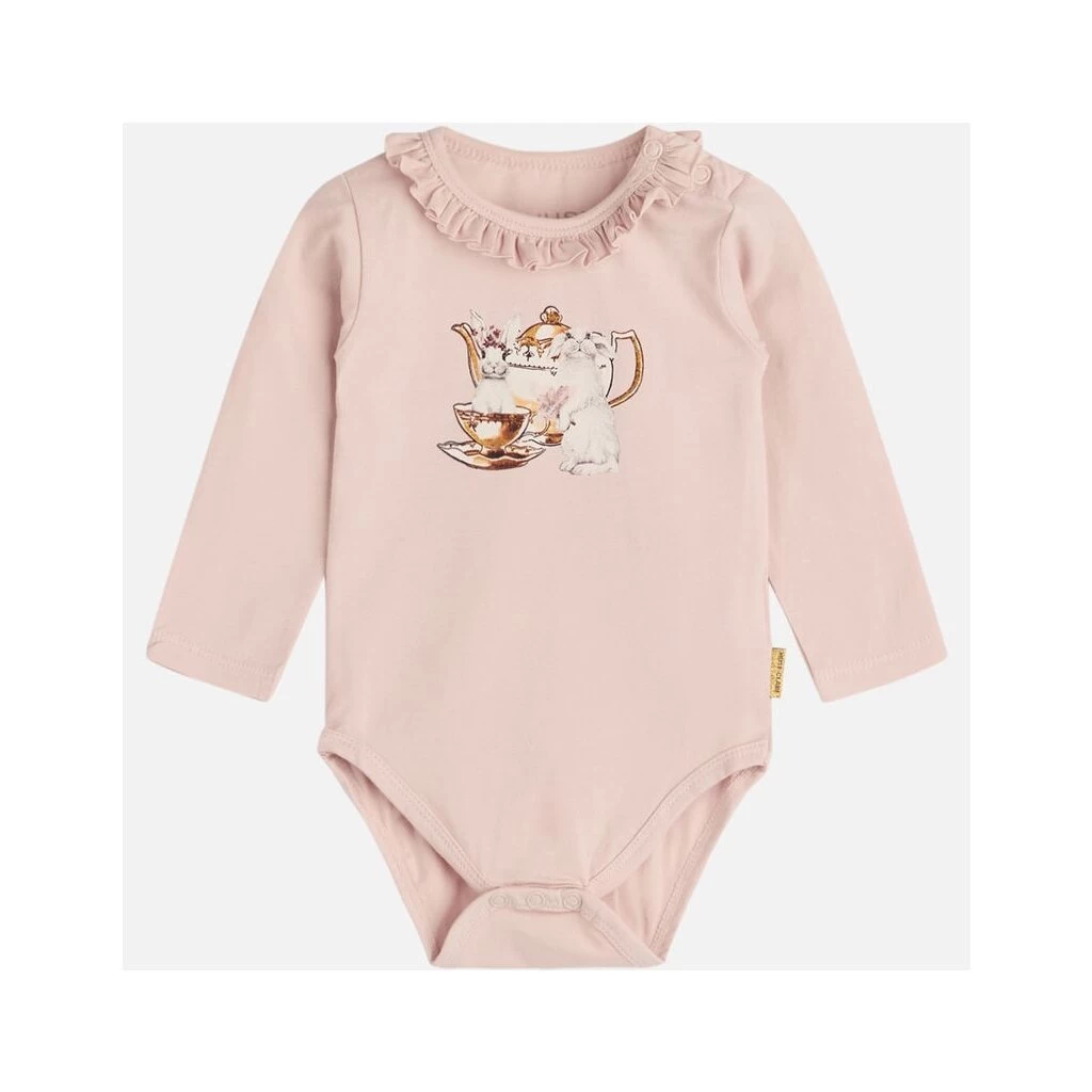 Bette – Bodysuit in der Farbe Peach skin und der von Hust and Claire Material: 95% Cotton 5% Elastane Langarmbody aus weicher, dehnbarer Baumwolle mit einem Print auf der Brust, der Kaninchen und eine Teekanne mit Tüll und Glitzerdetails darstellt. Dieses Modell verfügt über einen kleinen Rüschenkragen beim Hals. Verfügt über einen Knopfverschluss auf der linken Schulter und zwischen den Beinen. Dieses Produkt ist mit dem Label Contains Organic Cotton zertifiziert.