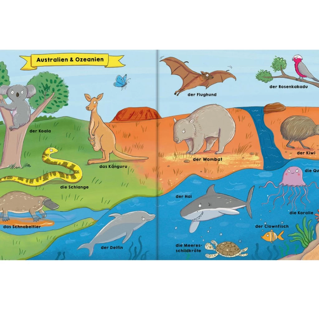 Wo wohnt eigentlich der Koala-Bär? Und wo die Zebras? Mit ihren lustigen Zeichnungen schickt Tessa Rath kleine Entdecker auf eine Reise zu allen Kontinenten, um die Grizzlys in Nordamerika zu besuchen, die Elefanten in Afrika, den Panda in Asien, die Kängurus in Australien und die Pinguine in der Antarktis. Dabei treffen sie auch unbekanntere Arten, zum Beispiel die Wüstenfüchse mit ihren langen Ohren. Der Ausflug in die Welt der Tiere zeigt, wie groß und schützenswert die Vielfalt der Natur ist.