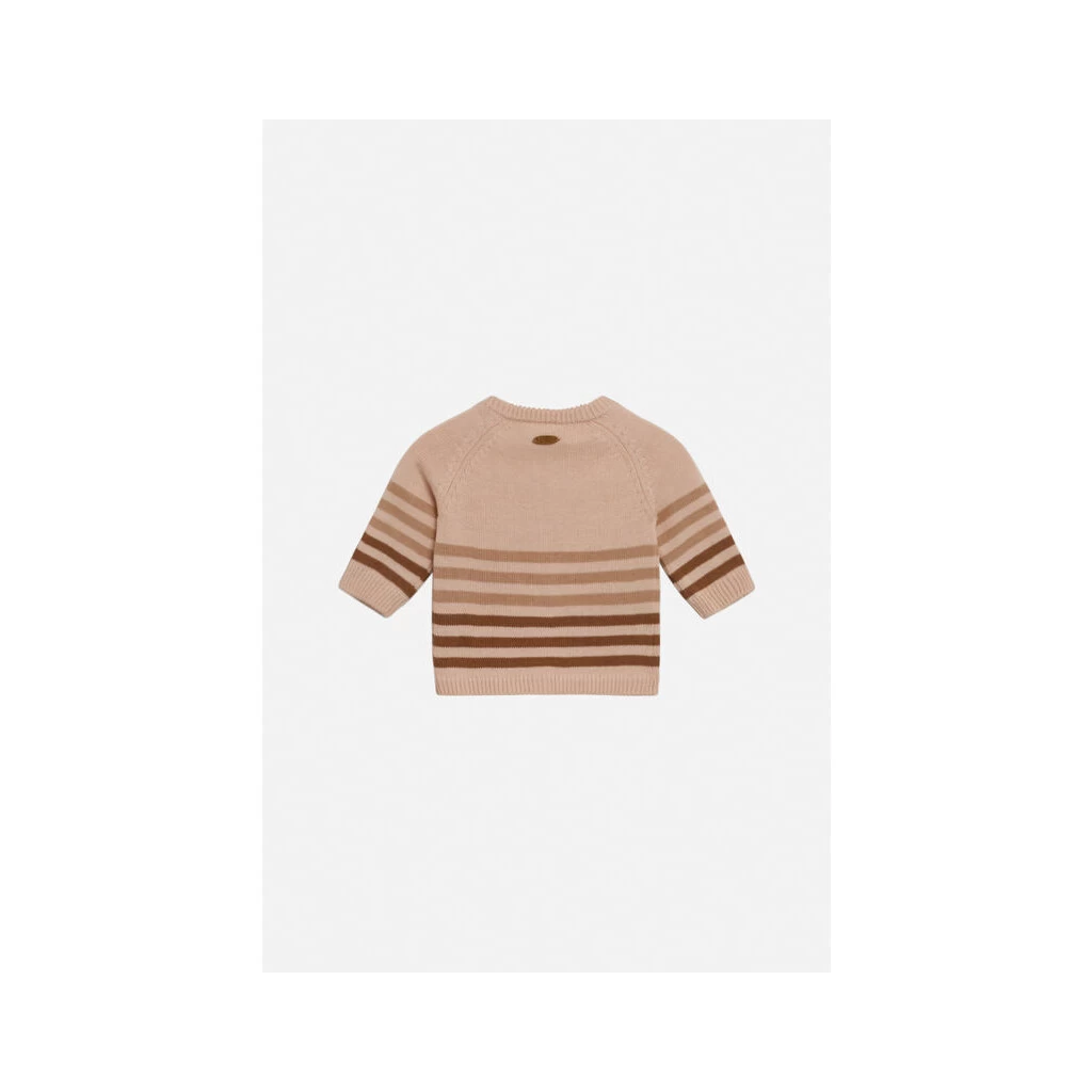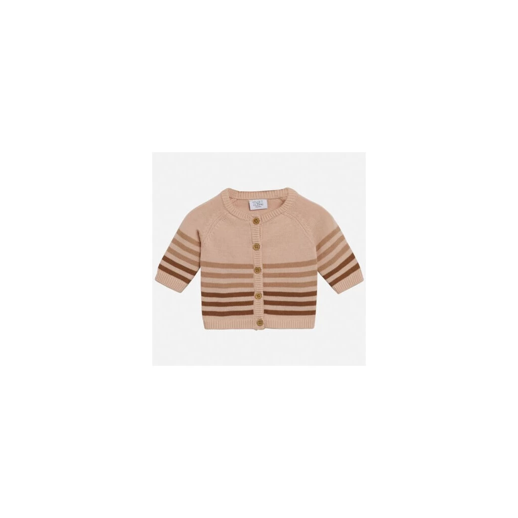 Charlie – Cardigan in der Farbe Apricot und der Größe 56 von Hust and Claire Material: 100% Cotton Cardigan aus weichem Glattstrick, der unten gestreift ist. Dieses Produkt ist mit dem Label Contains Organic Cotton zertifiziert.