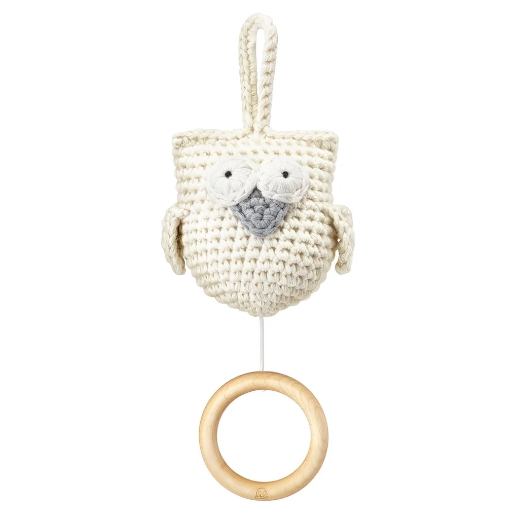 Super süße, von Hand gehäkelte Spieluhr – Eule Beige von Maylily. Die süße Eule bringt Ihren kleinen Schatz in den Schlaf.