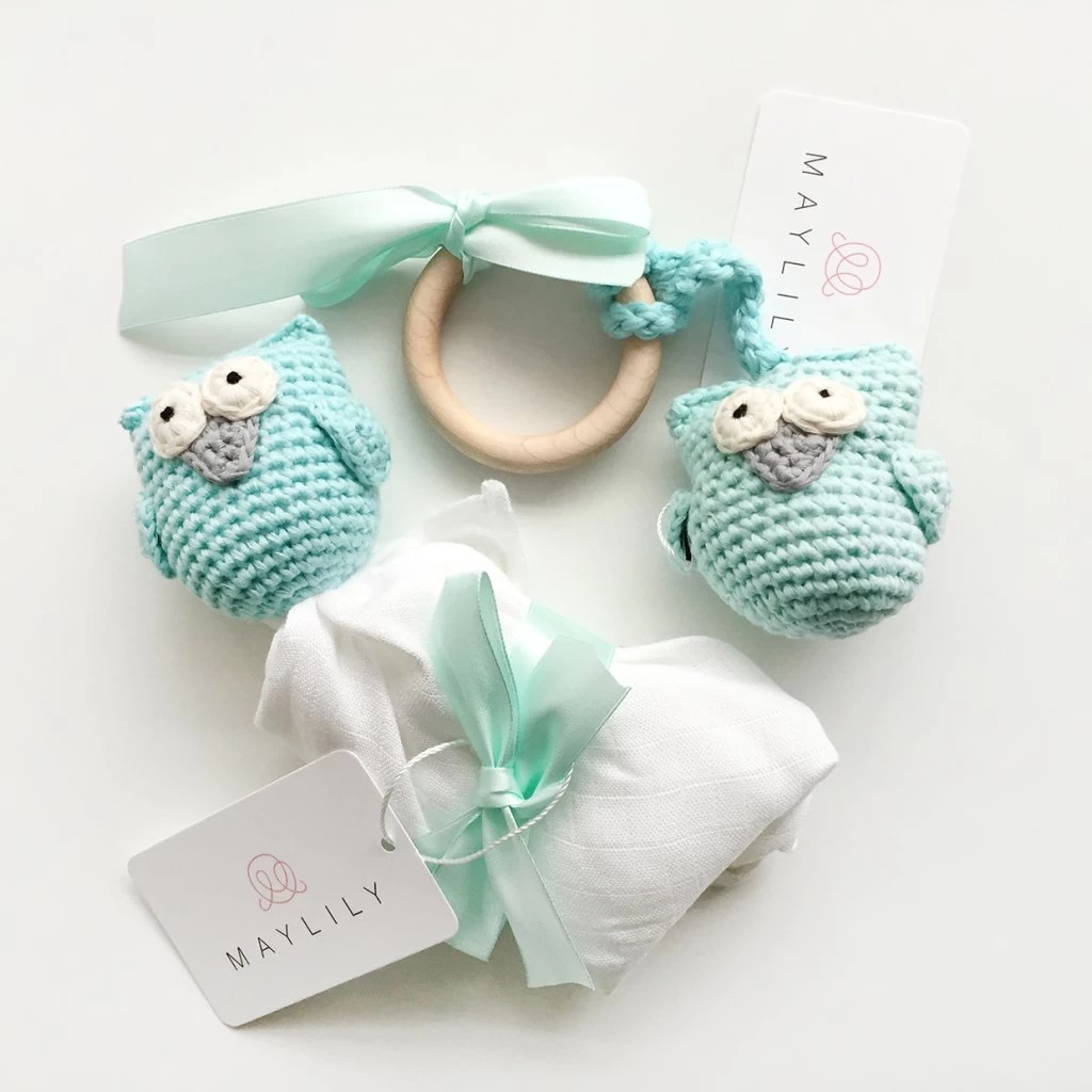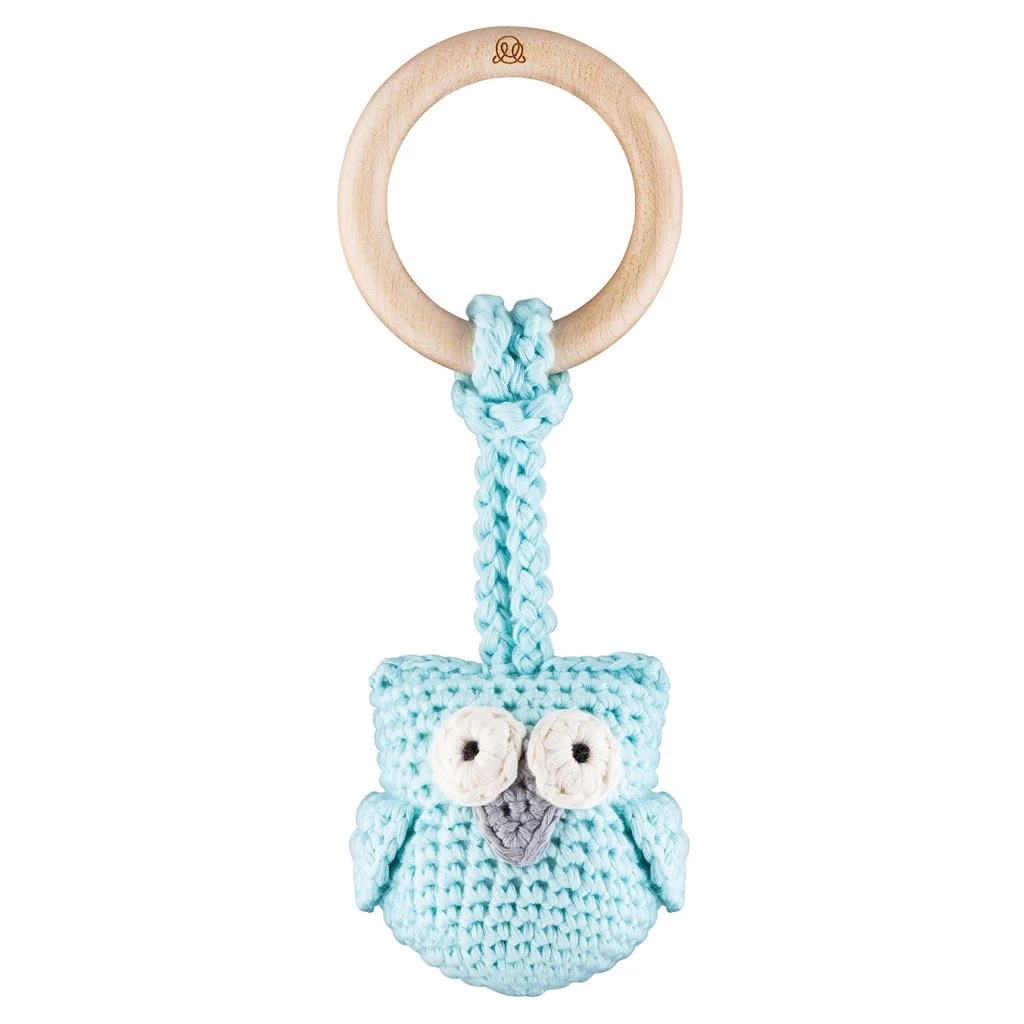 Dieser wunderschöne von Hand gehäkelte Beißring Eule in der Farbe Mint von der Firma Maylily ist der absolute Hingucker. Der Ahornholzring hilft Deinem kleinen Schatz beim Zahnen, er wurde mit Bio- Kokosöl imprägniert.