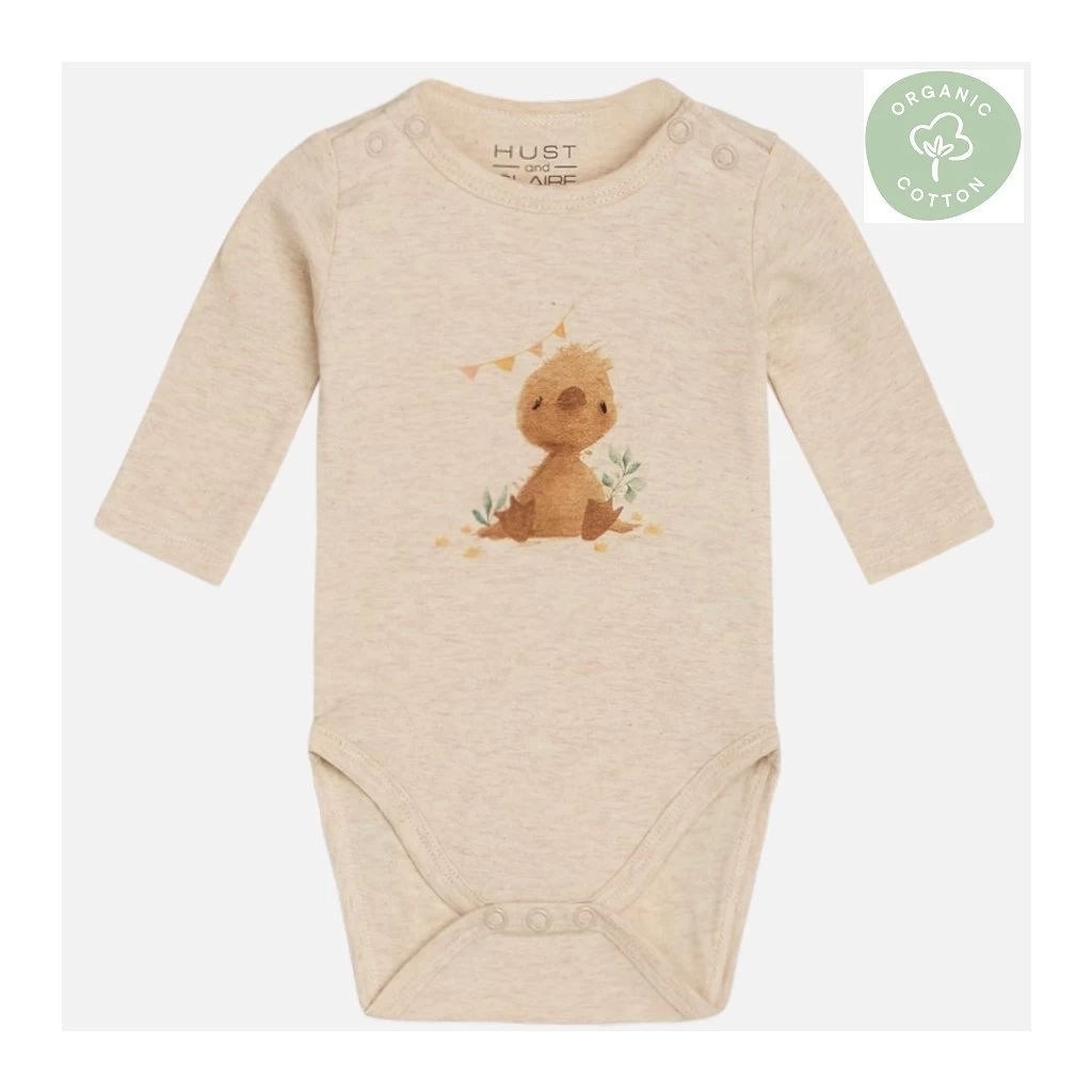 Langärmliger Body aus elastischer Baumwolle mit Entendruck auf der Brust. Knöpfe an den Schultern und zwischen den Beinen. Dieses Produkt ist GOTS- (Global Organic Textile Standard) zertifiziert.
