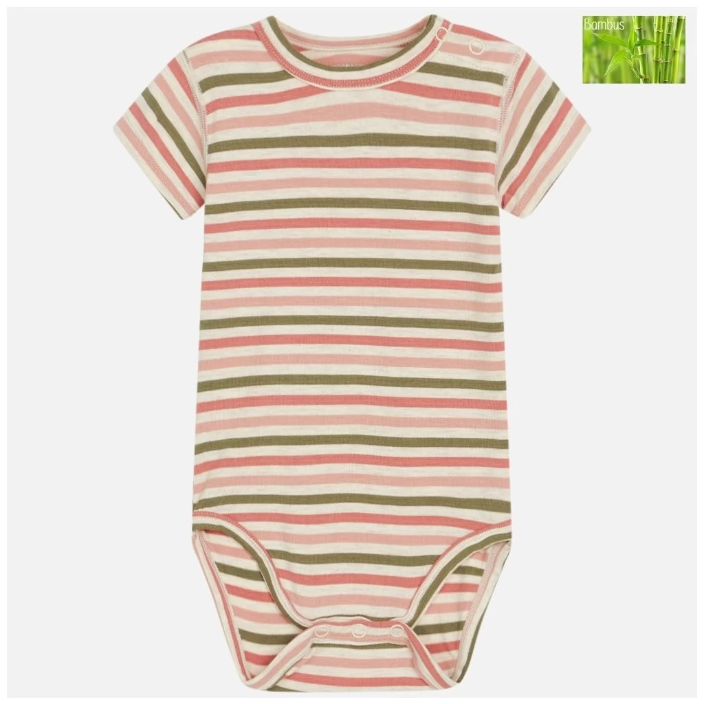 Kurzärmliger Body aus weicher und elastischer Bambusviskose mit Streifen. Knöpfe auf der linken Schulter und zwischen den Beinen. Dieses Produkt ist Oeko-Tex 100®-zertifiziert.