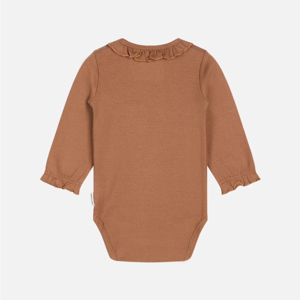 Langärmliger, gerippter Body mit Rüschenkragen und elastischen Bündchen. Wird an den Schultern und zwischen den Beinen befestigt. Dieses Produkt ist GOTS (Global Organic Textile Standard) zertifiziert.