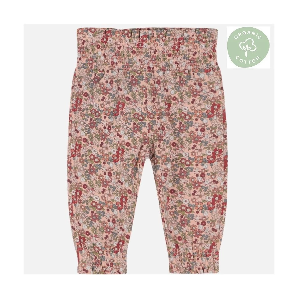 Hose aus weicher Baumwolle mit Blumendruck. Diese Version hat einen elastischen Smok in der Taille und an den Beinen. Dieses Produkt ist GOTS- (Global Organic Textile Standard) zertifiziert.