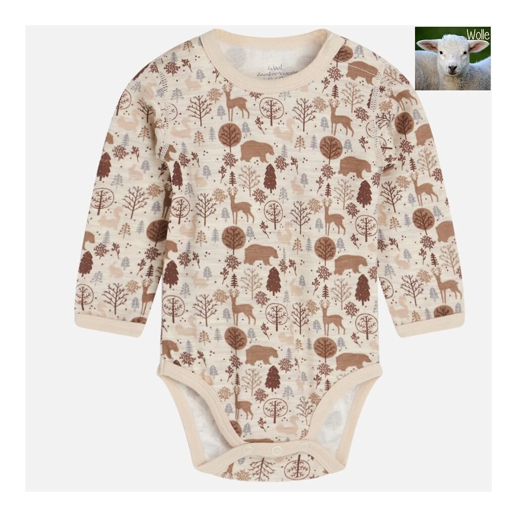 Langärmliger Body mit Naturmuster aus bequemer Stretch-Merinowolle/Bambusviskose. Druckknöpfe an der linken Schulter und zwischen den Beinen. Dieses Produkt ist Oeko-Tex 100® zertifiziert.
