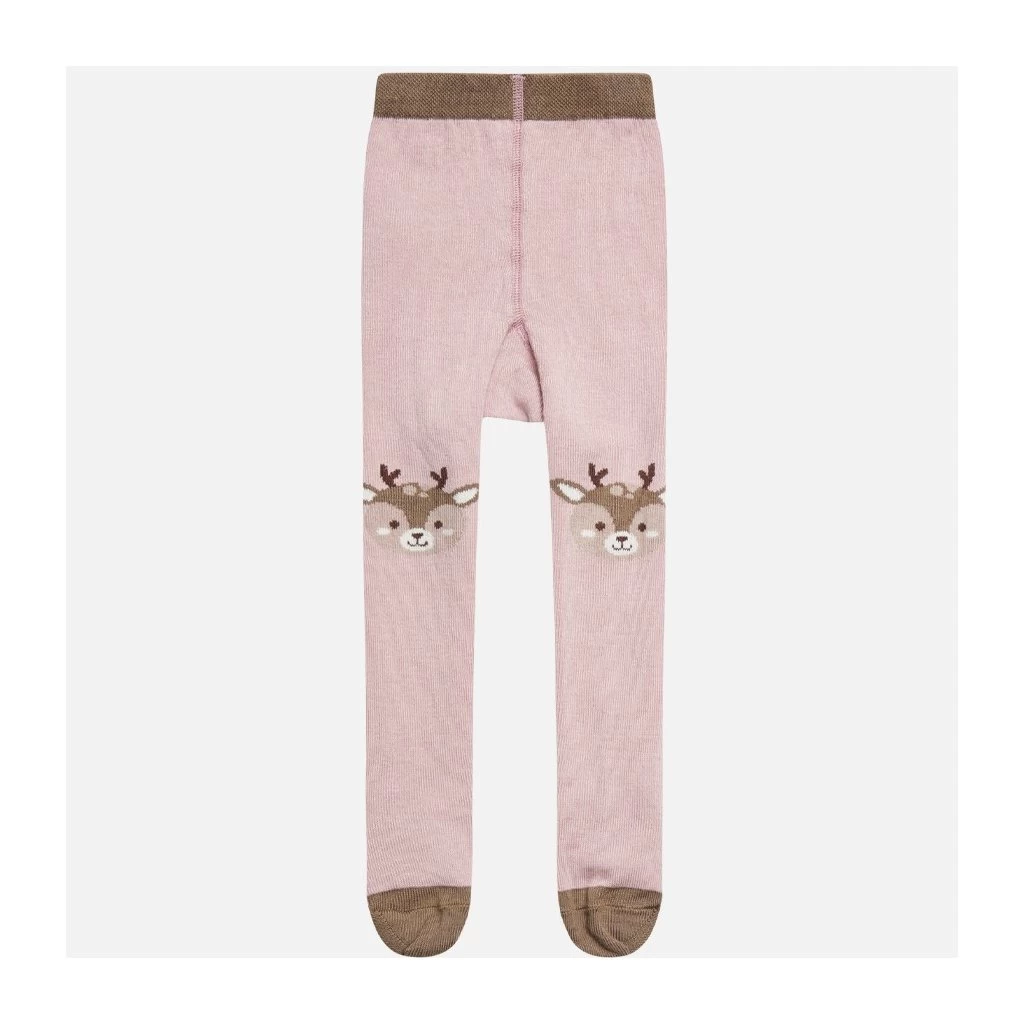 Strumpfhose mit einem Hirschgesicht auf den Knien. Dieses Produkt ist Oeko-Tex 100® zertifiziert und wird in Dänemark hergestellt.