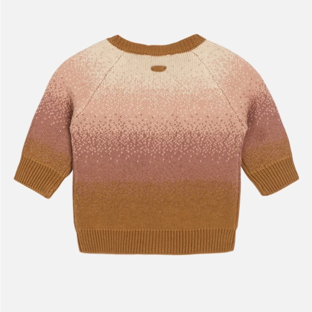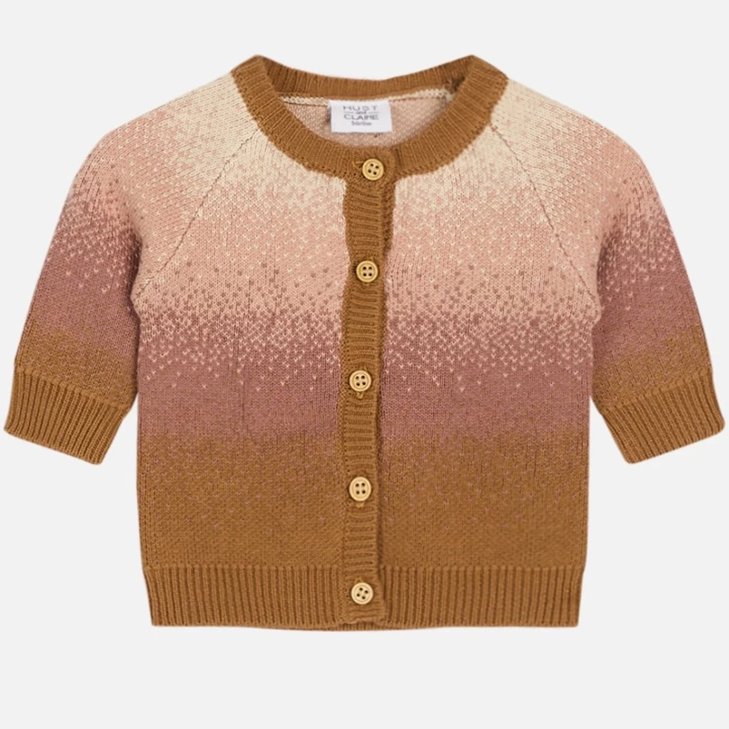 Strickjacke aus Baumwolle mit Ombre-Muster. Die Strickjacke hat einen gerippten Saum und einen Knopfverschluss vorne. Dieses Produkt ist aus 100 % Bio-Baumwolle hergestellt.