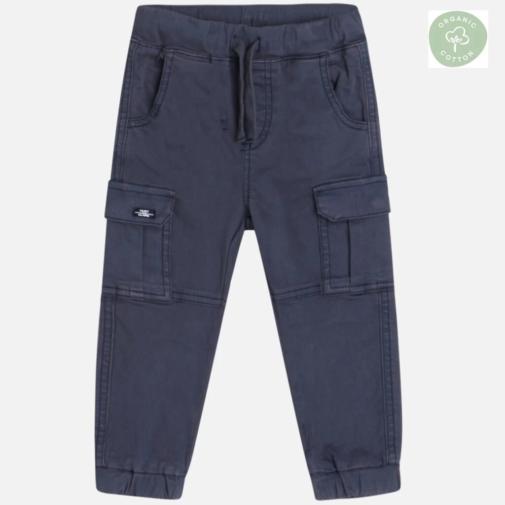 Hose aus weichem Stoff mit Taschen vorne und seitlich an den Hosenbeinen. Die Hose hat einen elastischen Bund mit angedeutetem Hosenschlitz und Kordelzug sowie elastische Beine. Dieser Stil hat diagonale Nähte über den Knien. Verstellbare Taille.