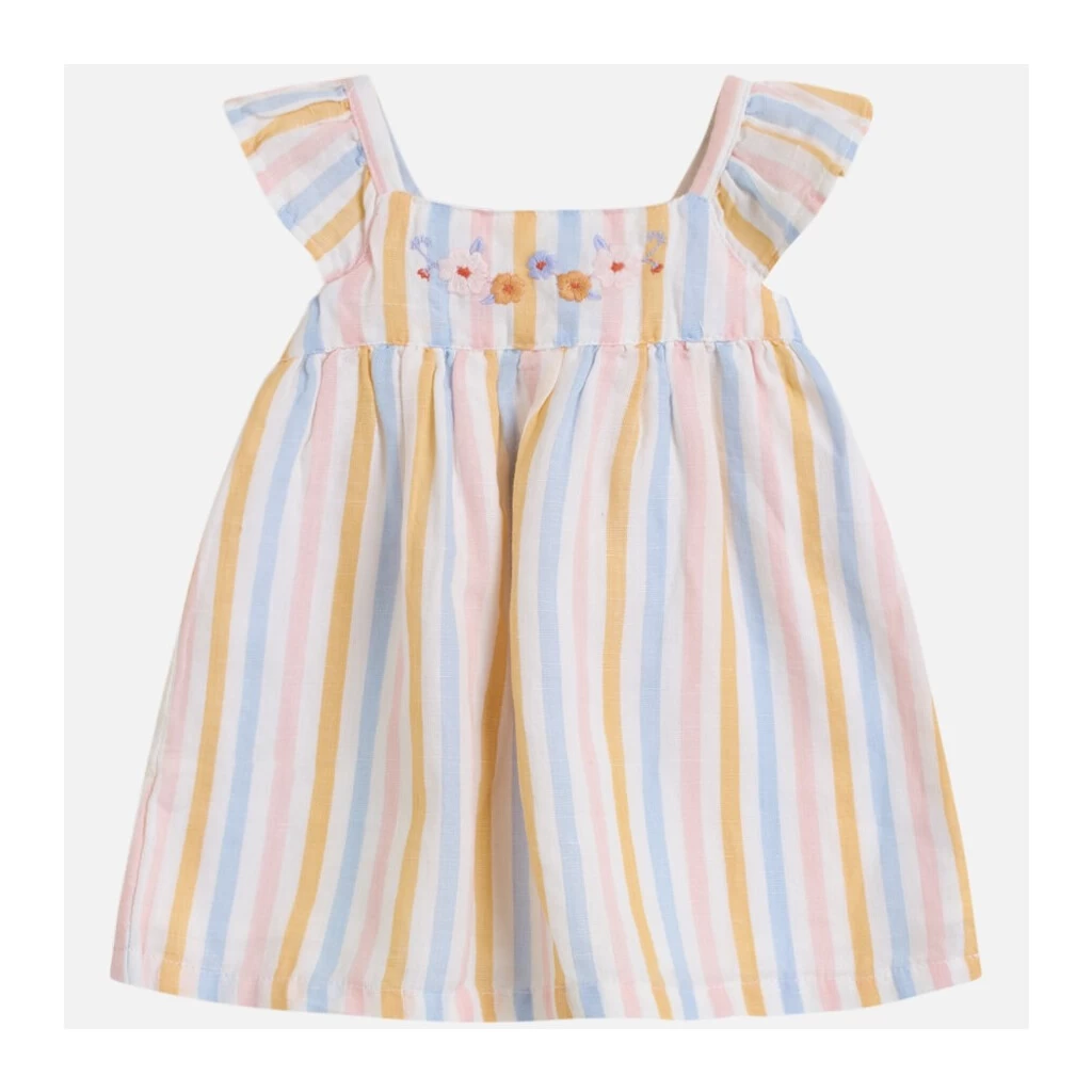 Kamilia – Dress in der Farbe White und der Größe 62 von Hust and Claire Material: 73% Cotton 27% Linen Kurzarmkleid aus gewebtem Leinen – entweder unifarben oder mit Streifen. Das Modell hat Rüschen an den Schultern, gestickte Blumen auf der Brust und ist im Brustbereich gerafft und so geschnitten, dass es unten über eine weite Passform verfügt. Der Innenrock ist aus weicher Baumwolle gefertigt. Am Rücken mit einem Knopfverschluss ausgestattet.