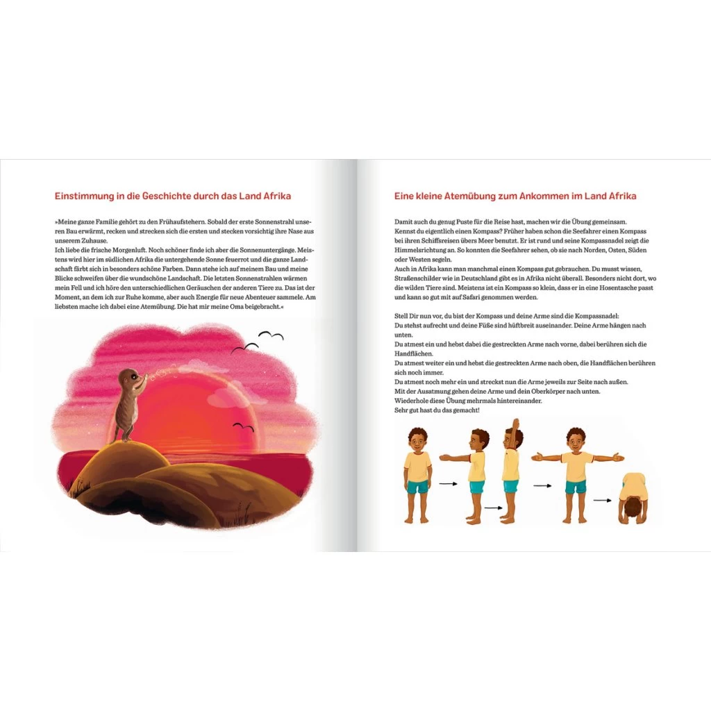 Das neugierige Erdmännchen Govinda nimmt kleine und große Kinder an die Hand und entdeckt mit ihnen die Tierwelt Afrikas. Kinderleicht ergeben sich aus den Bewegungen der Tiere Yogaübungen zum Mitmachen. Am Ende laden Atemübungen und eine Fantasiereise zum Entspannen ein. Es sind keine Vorkenntnisse nötig. Dieser leichte und spielerische Zugang zum Thema knüpft an die natürliche Kreativität, Fantasie und den Bewegungsdrang von Kindern an. So lernen sie, Stress abzubauen, und fühlen sich stark und besser im Leben verwurzelt. Ein Kinderyoga-Mitmachbuch für Kinder ab drei Jahren und deren Eltern.