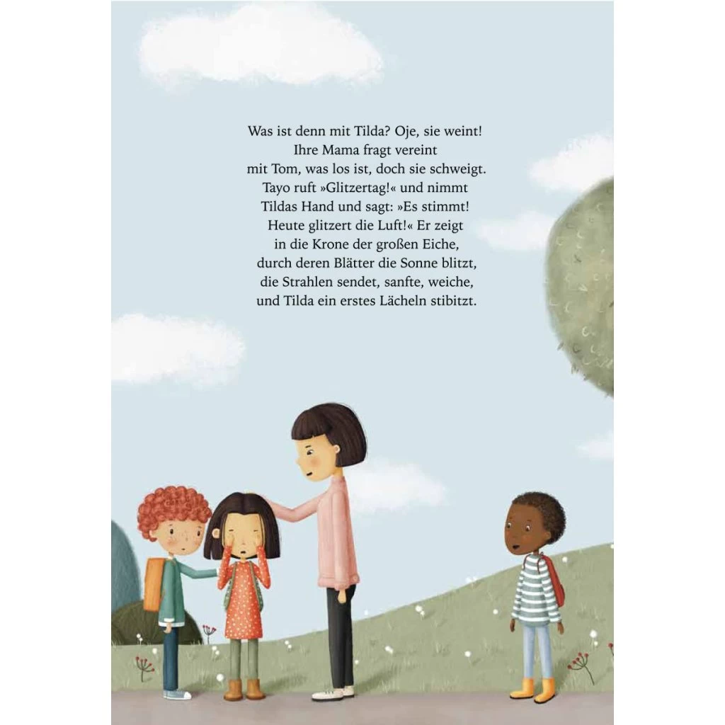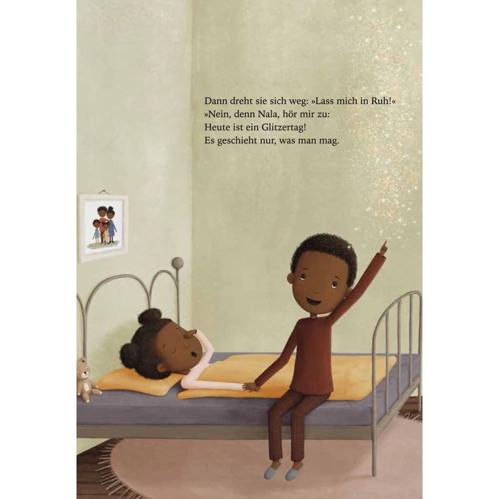 Doch die beste Entdeckung macht Tayo, als er abends im Bett liegt und spürt, dass wir dieses Glitzerlicht in uns tragen – wir alle, jeden Tag und ein Leben lang …
