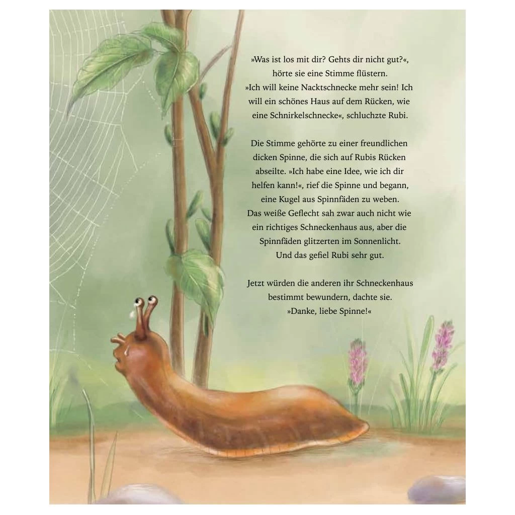 Die kleine Nacktschnecke Rubi ist furchtbar unglücklich. Sie findet sich zu nackig und wünscht sich nichts sehnlicher als ein eigenes Schneckenhaus. Einige Tiere wollen Rubi helfen, sich diesen Wunsch zu erfüllen. Doch dann erkennt die kleine Schnecke, dass man zum Glücklichsein gar nicht anders sein muss …