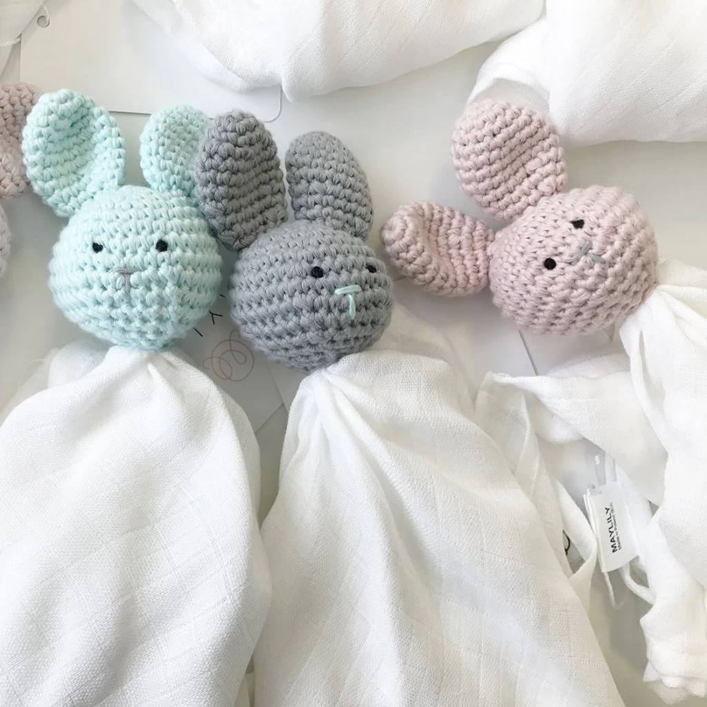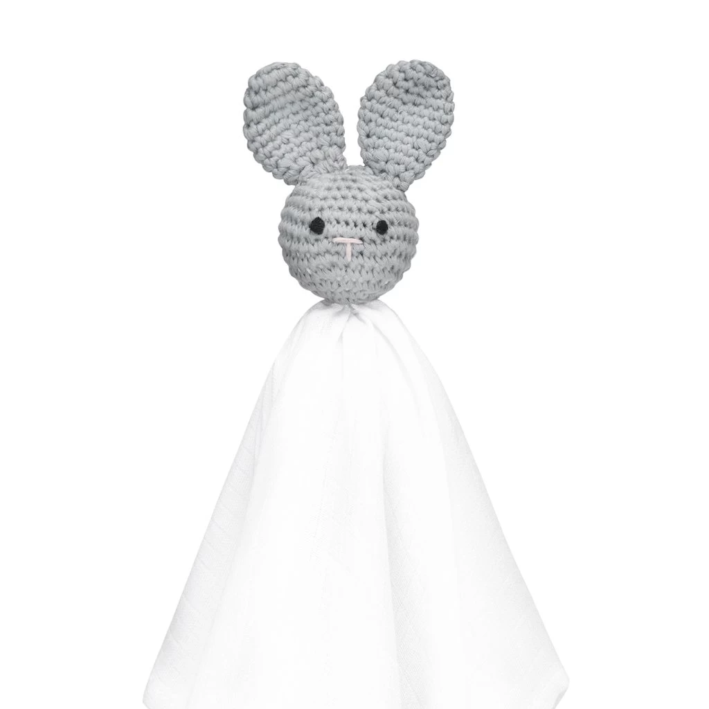 Ab ins Bettchen, dein Lieblingshase wartet.. Dieses super süße Kuscheltuch XL von Maylily in der Farbe Grau mit süßem Hasen wird der neue Liebling von Ihrem Schatz.
