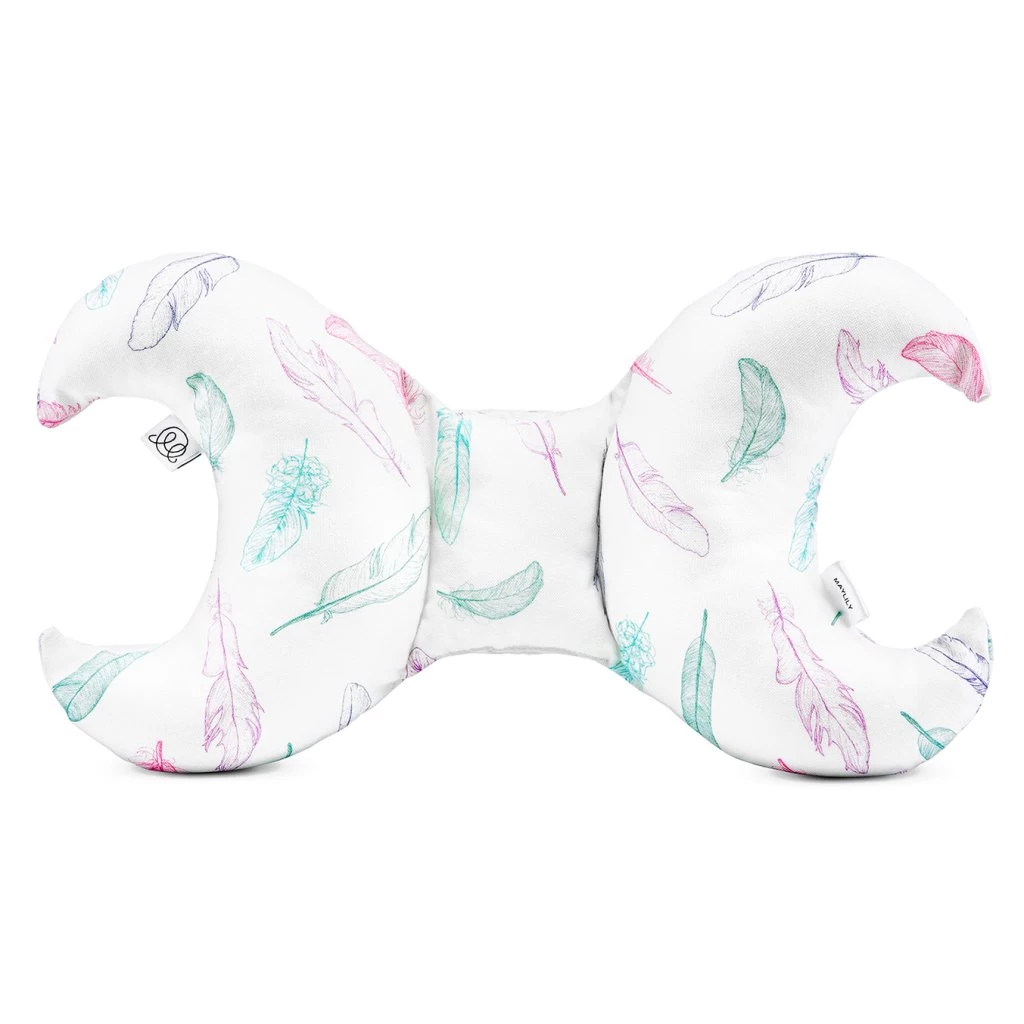Ab ins Bettchen, oder in den Kinderwagen. Dieses super süße Bambuskisssen von Maylily mit wunderschönem Design Federn hilft Ihrem kleinen Liebling dabei seine Rückenschlafposition beizubehalten. Auch auf Reisen schützt es den Kopf Ihres Babys im Autositz vor Erschütterungen