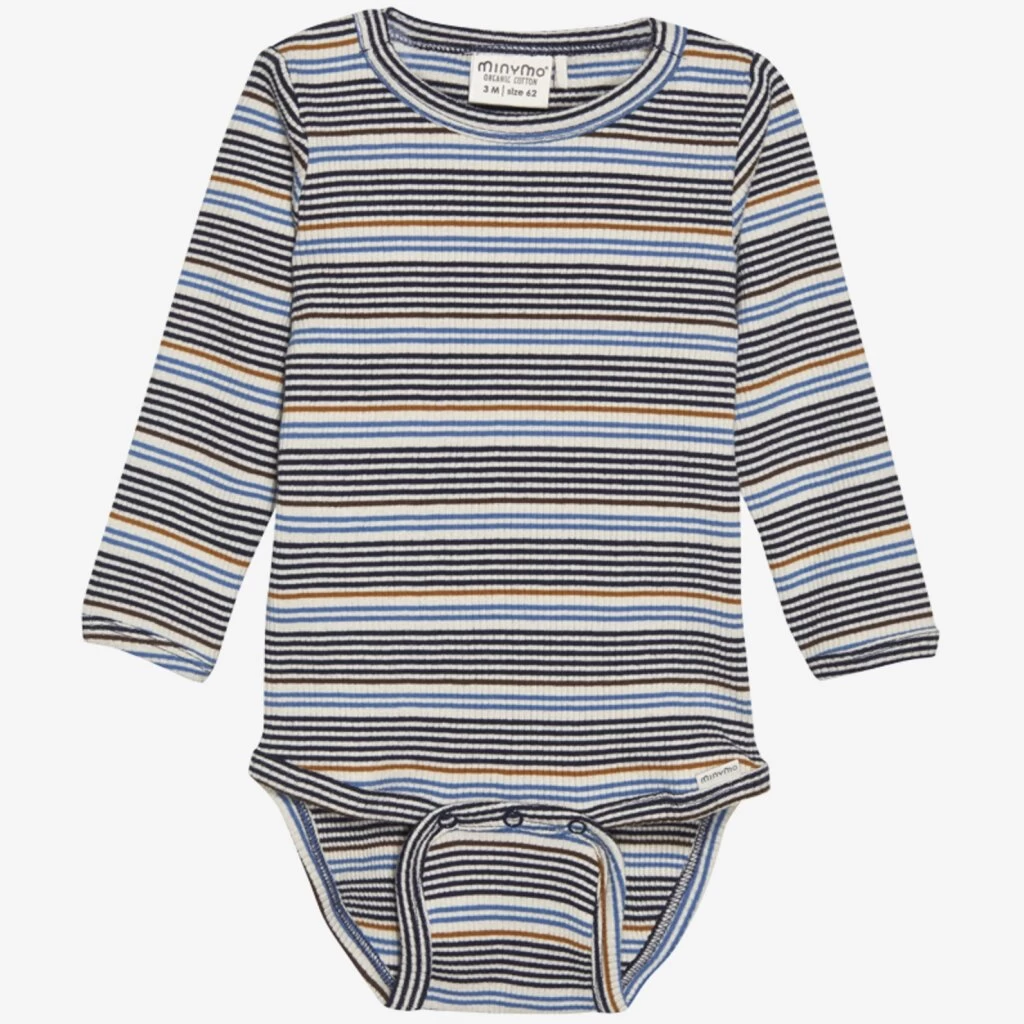 Langarm-Body von MINYMO. Der Body lässt sich mit praktischen Druckknöpfen an beiden Schultern und zwischen den Beinen öffnen und ermöglicht so ein einfaches An- und Ausziehen. Der Körper ist mit einem Allover-Streifenprint versehen.