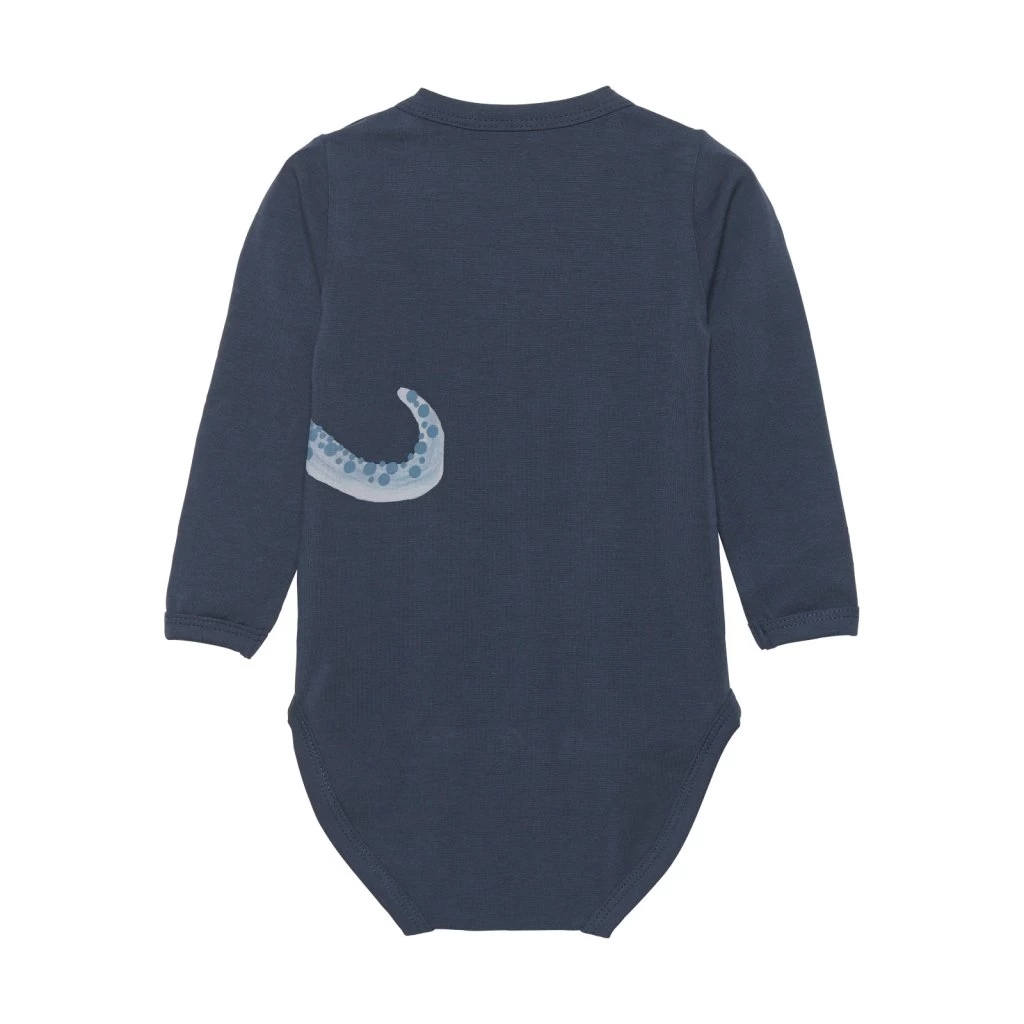 Langärmliger Body aus Baumwolle von Minymo. Der Body ist einfarbig mit Frontprint. Geschlossen wird es mit praktischen Druckknöpfen an beiden Schultern und zwischen den Beinen. Hergestellt in einer Baumwollqualität, die sich weich und angenehm auf der Haut anfühlt. Zertifiziert gem. nach GOTS – Bio CERES-0366