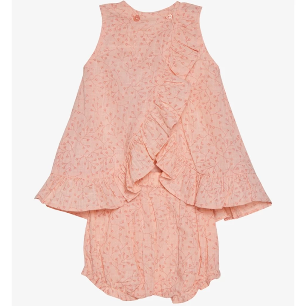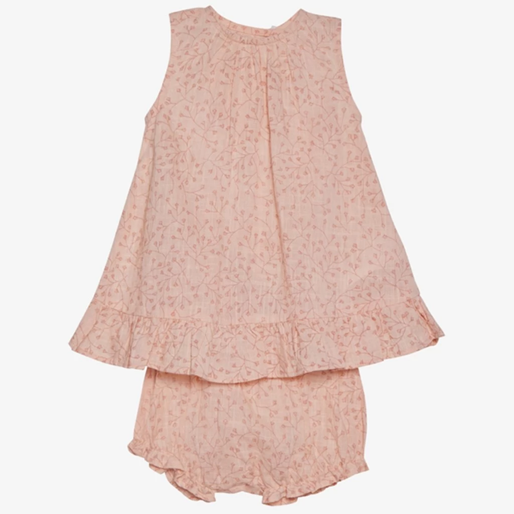 Sommerkleid mit passenden Bloomers mit Allover-Print von Minymo. Das Kleid ist ärmellos mit einem feinen faltigen Rand an der Unterseite. Auf der Rückseite des Kleides hat es einen Wrap-around-Effekt. Die Bloomers haben einen schönen Rüschenrand und eine Elasti-Taille.
