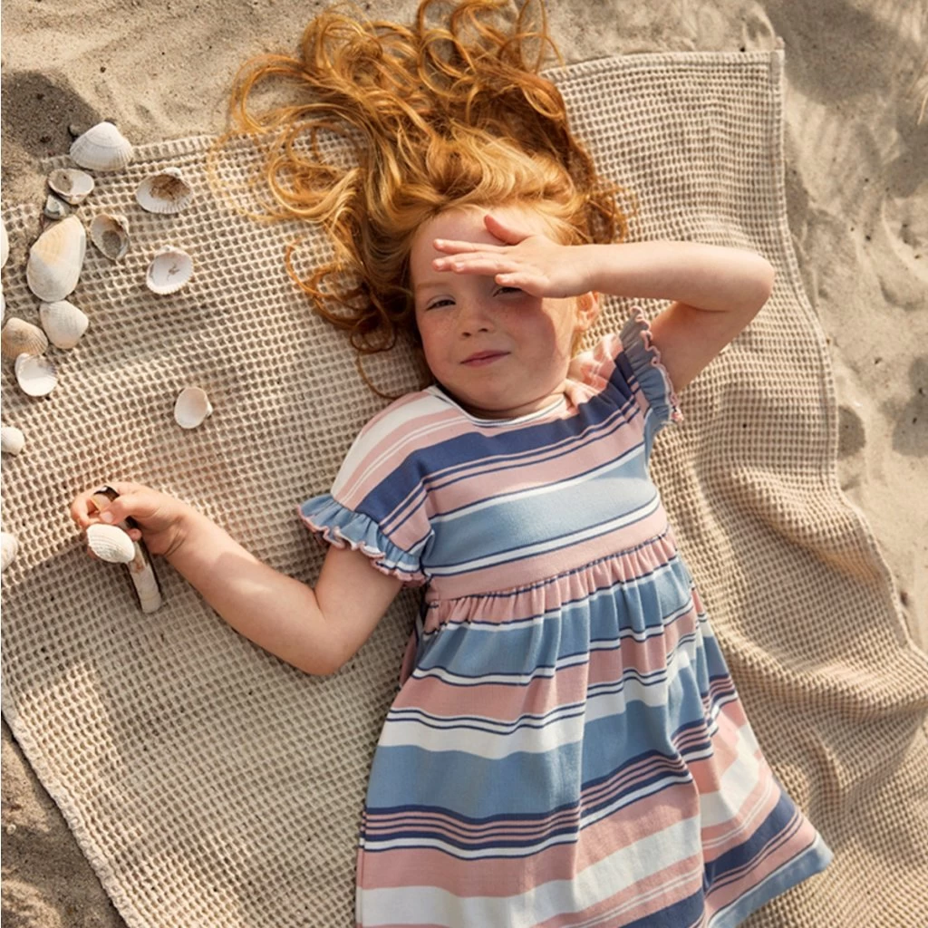 Niedliches allover gestreiftes kurzärmeliges Kleid. Das Kleid besteht aus weicher Rippe mit Rundhalsausschnitt und hübschen faltigen Details unter der Brust. Das Kleid schließt mit einem Knopf auf der Rückseite.