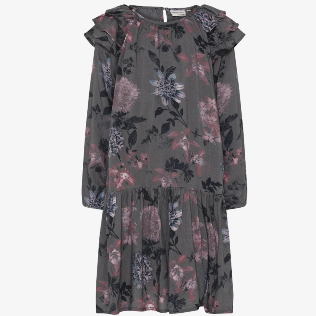 Gewebtes Kleid von MINYMO. Es ist allover mit großen Blumen bedruckt und hat mehrere Lagen Rüschen an den Schultern. Feine Raffung am Ausschnitt sowie im unteren Teil des Rocks. Gummizug am Ende der Ärmel. Es wird mit einem Knopf auf der Rückseite geöffnet, so dass es leicht an- und auszuziehen ist.