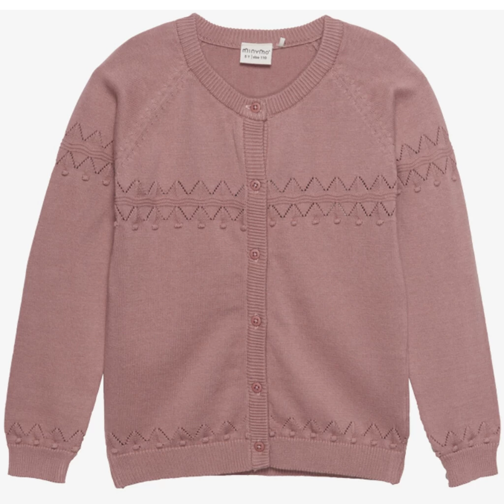 Schöne schlichte Strickjacke von MINYMO. Der Cardigan besteht aus Baumwollstrick und hat lange Ärmel und einen Rundhalsausschnitt. Die Strickjacke wird vorne mit Knöpfen geschlossen. Es gibt ein schönes Strickmuster sowie gerippte Kanten. Die Ärmel sind Raglanärmel und sorgen für einen schönen Look. Zertifiziert gem. nach GOTS – Bio CERES-0366.