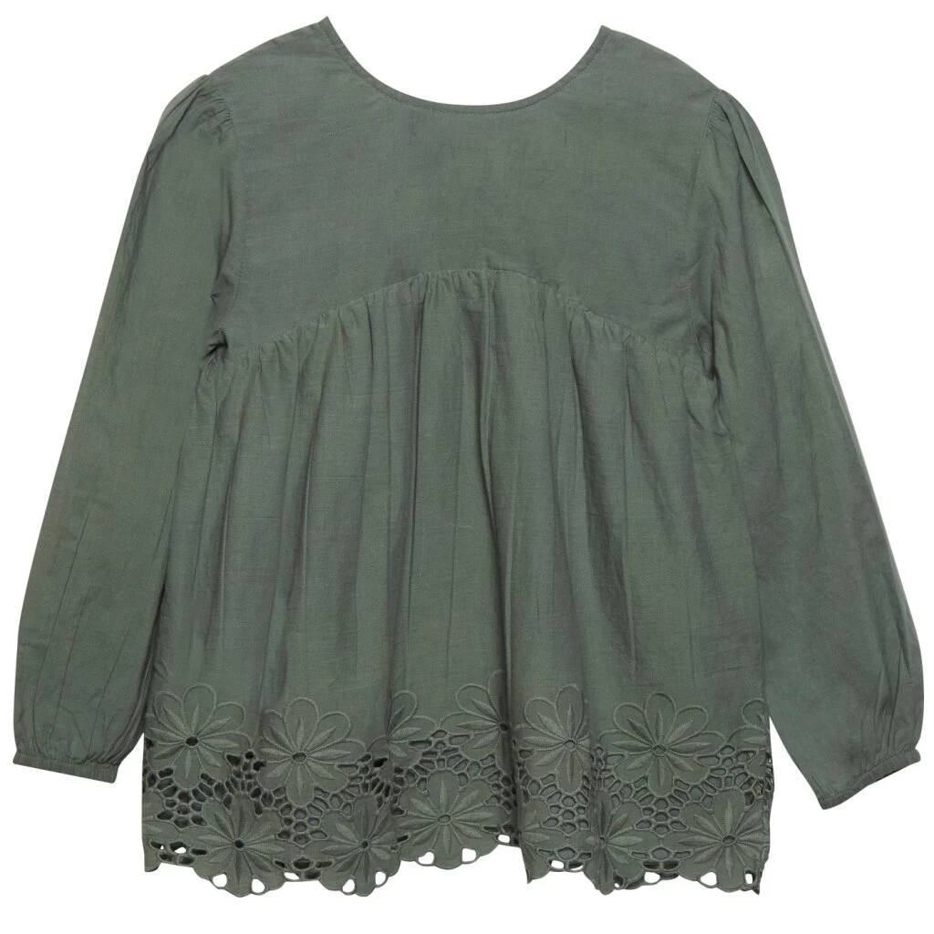 Schöne Tunika mit feinen Stickerei-Anglaise-Details. Das Kleid hat einen Gummizug an den Handgelenken, der genau wie an den Schultern einen schönen Raffungseffekt ergibt.
